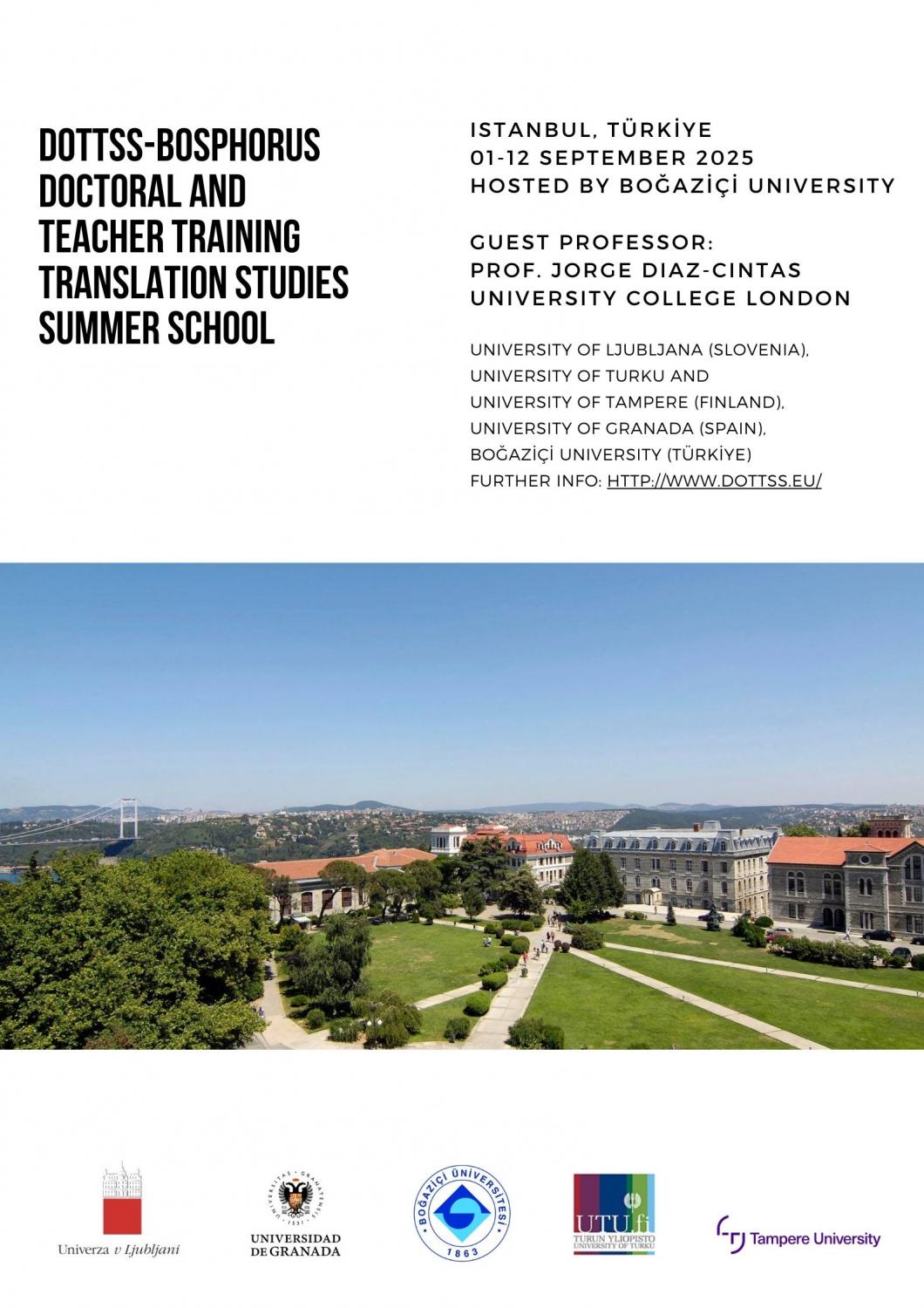 Doctoral and Teacher-Training Translation Studies Summer School (DOTTSS) is a joint initiative of 5 different universities: University of Ljubljana (Slovenia), University of Turku (Finland), University of Tampere (Finland), University of Granada (Spain) and Boğaziçi University (Türkiye). Since 2012 the summer school has hosted doctoral students of TS and teachers of translators and interpreters from all around the world. The first two schools were held in Piran, Slovenia (Emuni 2012, Stridon 2013), the third was in Granada, Spain (Ibn Tibbon 2014), the fourth in Turku, Finland (Agricola 2015), the fifth in Piran, Slovenia (Stridon 2016), the sixth in Granada, Spain (Ibn Tibbon 2017), the seventh in Tampere, Finland (DOTTSS 2018), the eighth in Ljubljana, Slovenia (Stridon 2019), the ninth in Istanbul, Türkiye (Bosphorus 2021), the tenth in Granada, Spain (DOTTSS 2022), the eleventh in Tampere, Finland (DOTTSS 2023), and the twelfth in Piran, Slovenia (DOTTSS 2024). The thirteenth event will be held at Bogazici University in Istanbul, Türkiye (DOTTSS 2025). The local organizers add to DOTTSS a name that connects the summer school to a particular translational tradition in the region: the name of the school in Turkey foregrounds the position of Istanbul as a “translational city”, connecting as well as separating continents, cultures and traditions.